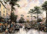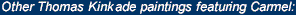 Ten years ago I painted Carmel, Ocean Avenue on a Rainy Afternoon, and from the day I finished it, I dreamed of working on a second view of the famous scene. Carmel, Sunset on Ocean Avenue is that long awaited painting! Like the first piece, this painting is overflowing with the kind of details I love to paint: the old mission bell in its stone portico, the stately Monterey pines that shroud the avenue, and the bustling people (even a dog or two!) that are so much a part of the ambiance of Carmel. Even the members of my immediate family managed to find their way into the painting. My two older girls peer out of a vintage blue convertible while my two younger daughters make their way across the street and my wife Nanette pauses beside her bicycle to watch an artist at work. (Guess who posed for the artist!) My romantic vision of Carmel is also enlivened by many vintage cars and the charming buildings of the seaside town - the lights of which reflect, jewel-like, in streets moistened by the passing of ocean mists. And, of course, a luminous sunset bathes the entire scene in a warm glow, as though a tranquil moment has been frozen in time. -Thomas Kinkade- |