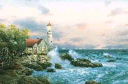 | Beacon of Hope is a product of imagination and an allegory of faith. A small boat, barely visible on the horizon, rides heavy seas that surge and crash onto a rocky coast; the lighthouse beacon is its sole guide. The keeper's house is a safe haven against all storms. | ||