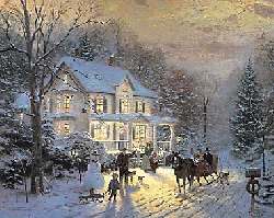 | Home for the Holidays is an example of memory and imagination blending together to create an idyllic vision. Who hasn't daydreamed about taking a frosty sleigh ride to visit friends for a bit of Christmas Eve cheer? Presents will be exchanged, prayers offered, and perhaps a mug of steaming cider will send you on your way. By the way, my three year old daughter, Merritt, is a wonderful model for paintings like this, and in tribute to her efforts, her name adorns the mailbox to the right of the sleigh. | ||