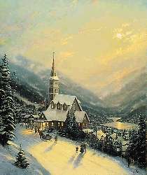 | In my travels throughout America I've noticed that churches are often built on a hillside or knoll as a means of emphasizing their presence in a town, and I find this to be a particularly poignant concept. These hillside churches, like lighthouses, are high up, so that, figuratively speaking their light might be seen from afar. I wanted to capture a bit of that feel in my painting, Moonlit Village. | ||