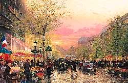 | My Paris, City of Lights could be titled The Kinkade family in Paris. I've set the time machine back a few decades and included myself (in the red beret), painting the fabulous Café Nanette. The real Nanette, holding baby Chandler, hails a cab, while our | ||