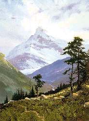 | Spring in the Alps fondly recalls a maiden voyage to the Alps in 1985. A great peak, perhaps the famed Jungfrau, lends its snowclad dignity to Spring in the Alps, while delicate alpine flowers bloom and trees stand as silent sentinels. | ||