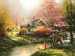 | Stepping Stone Cottage, second in my Sweetheart Hideaways collection, represents the refuge of my love, my family, my art, and my faith. Natural stepping stones lead across the water to the welcoming door. | ||