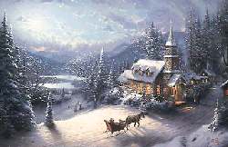 | Snow is a wonderful mirror for moonlight, bathing the landscape in a soft silver glow. Here is a church built on a hillside, where it becomes a beacon of hope for its village; worshippers arrive in a swift, cozy horse-drawn sleigh. The moonlight casts d | ||